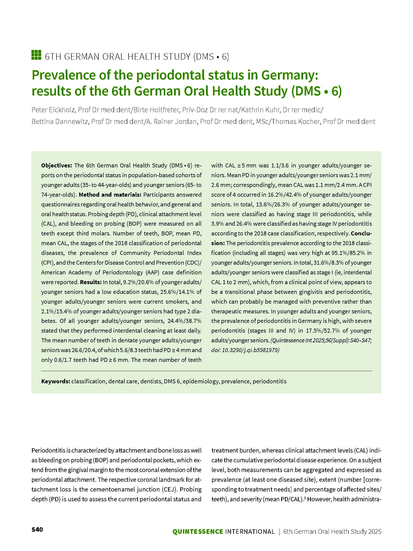 Im Rahmen der Sechsten Deutschen Mundgesundheitsstudie (DMS • 6) wurde der Parodontalstatus der jüngeren Erwachsenen (35- bis 44-Jährige) und der jüngeren Seniorinnen und Senioren (65- bis 74-Jährige) ermittelt.