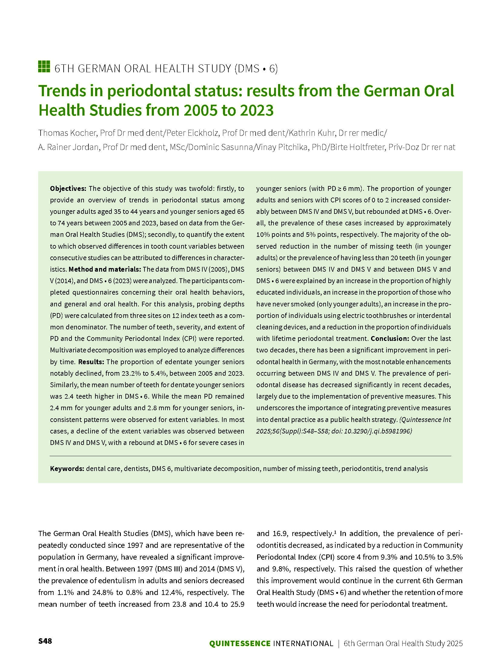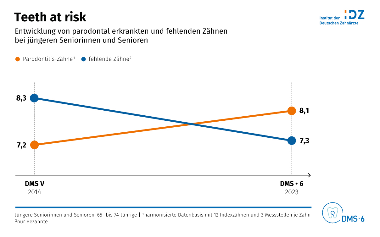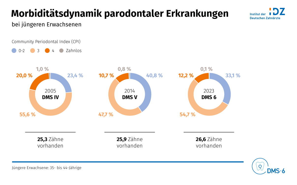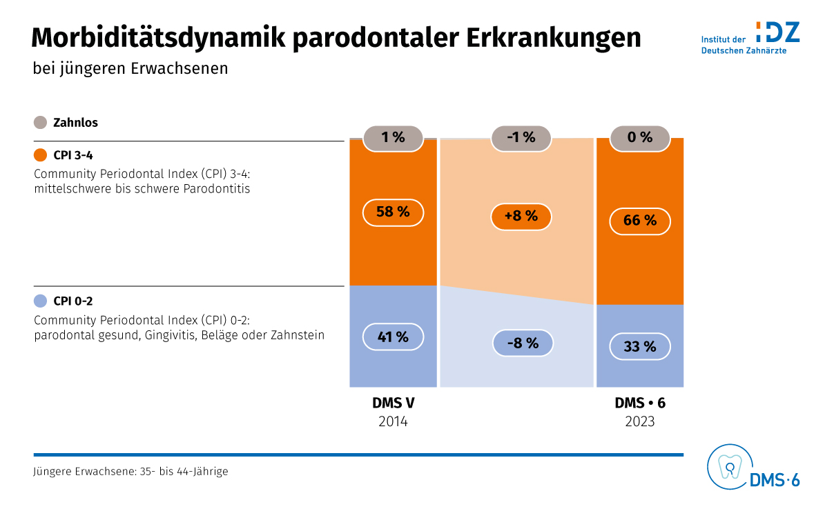In den letzten zwei Jahrzehnten hat sich die parodontale Gesundheit in Deutschland erheblich verbessert, wobei die größten Fortschritte zwischen DMS IV und DMS V zu verzeichnen waren.