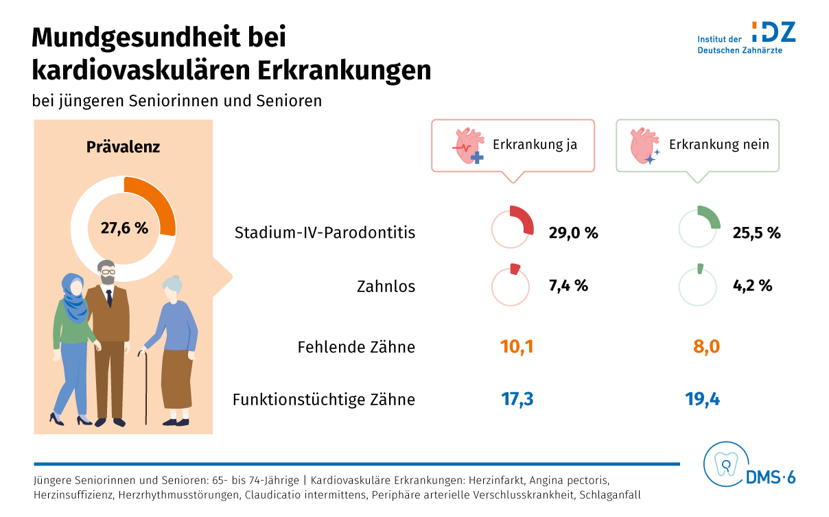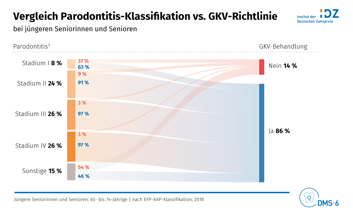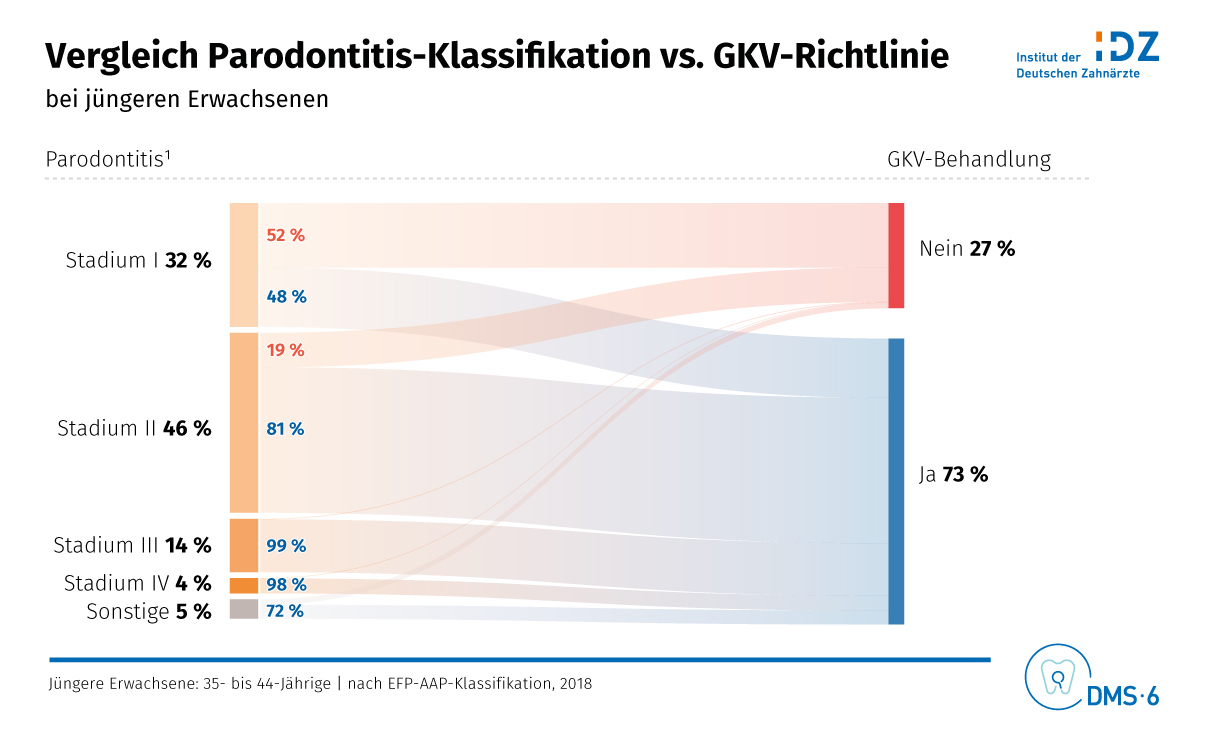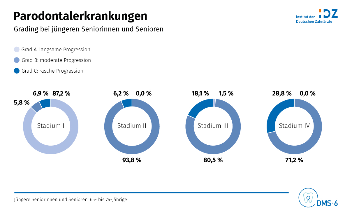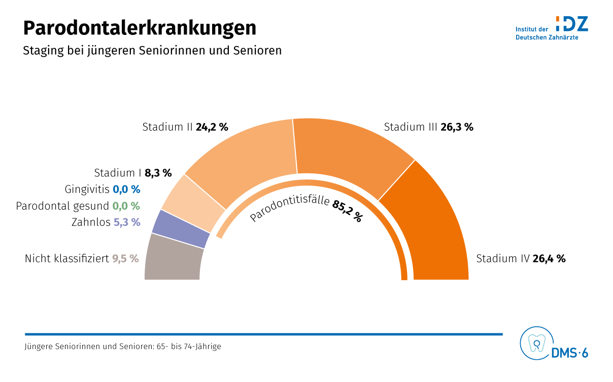 Die Prävalenz von Parodontitis ist bei jüngeren Erwachsenen und jüngeren Seniorinnen und Senioren in Deutschland hoch und liegt bei schweren Formen der Parodontitis (Stadium III und IV) bei 17,5 %/52,7 %.