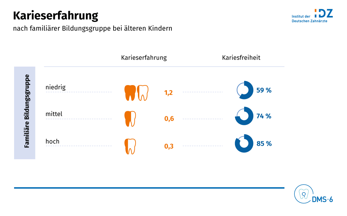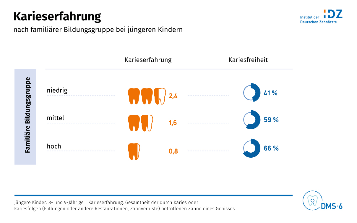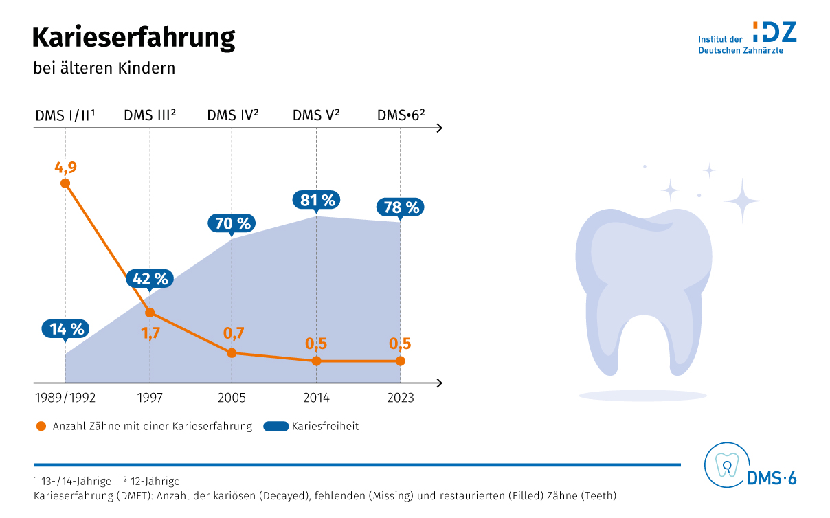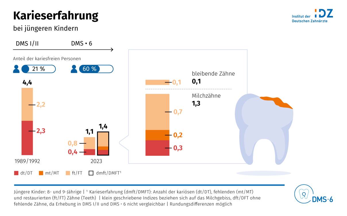 Die Karieserfahrung bei 8- und 9-Jährigen lag bei 1,4 Zähnen, kariesfrei waren 59,9 %.